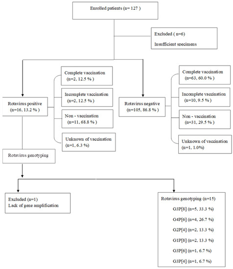 We collected stool samples from 127 children under the age of 5, excluding newborns less than 4 weeks of age, who were admitted to Daejeon Eulji University Hospital for acute gastroenteritis between 20 February 2012, and 31 March 2013. Inclusion criteria included the children with the following: (1) loose or watery stool three or more times over 12 h and (2) abnormal stools associated with fever, vomiting, or severe abdominal pain. Children with other diseases, such as pneumonia, otitis media, or other chronic gastrointestinal disorders, were excluded [9]. Clinical information of the participants was collected from the questionnaires completed by the parents or guardians of the children who agreed to provide information. The RV vaccination status of patients was determined based on parent reports and medical records. The enrolled patients included patients from both urban and rural areas, and no information on parental income was collected.