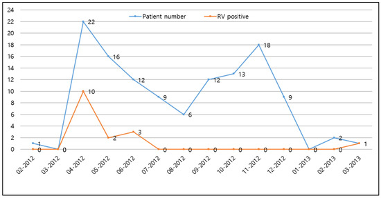 Of the 127 children recruited in this study, 6 were excluded from RV screening because of insufficient specimens. Of the remaining 121 patients, 16 patients (13.2%) were positive for the RV antigen (Table 1, Figure 1). Moreover, seasonal variation in RV infection was observed, with a peak in April 2012 (Figure 2). However, no statistically significant difference in RV positivity and demographic data, such as age, gender, gestation, birth weight, and delivery method, except the presence of siblings, was observed between the patients positive and negative for the RV antigen (Table 1).