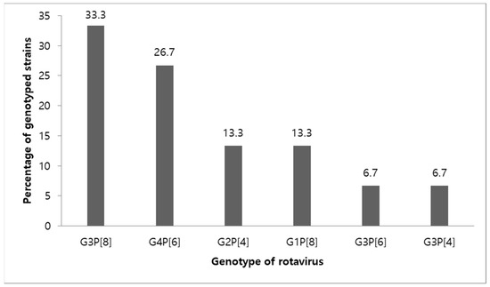 Multiplex polymerase chain reaction (PCR) was performed for RV genotyping. If the samples were not amplified successfully via multiplex PCR, Sanger’s sequencing was performed for genotyping as described previously [12,13]. In brief, RNA was pulled out from the fecal samples using the QIAamp viral RNA mini kit (Qiagen GmbH, Hilden, Germany). Then, the G and P genotypes were analyzed via reverse transcription polymerase chain reaction (RT-PCR) [12,13,14]. RT-PCR was used to identify the G genotypes with Beg9 and End9 primers. In addition, nested multiplex PCR was used to identify the G genotypes with End 9 and type-specific primers (aBT, aCT2, aFT3, aDT4, aAT8, and aFT9). To identify P genotypes, Con2 and Con3 primers were used in RT-PCR and Con3 and type-specific primers (1-T1, 2-T1, 3-T1, and 4-T1) in nested multiplex PCR according to the PCR conditions described previously [12,13]. Then, 10 μL of each PCR product was electrophoresed on 1.5% agarose gel (Sigma-Aldrich, St. Louis, MO, USA), stained with ethidium bromide, and observed under ultraviolet illumination. If the samples were not sufficiently amplified via nested multiplex PCR, Sanger’s sequencing was practiced with primary primers and primary RT-PCR products by Macrogen (Daejeon, Korea). Genotypes were identified by performing phylogenetic analysis with the Claustral Omega program (http://www.ebi.ac.uk/Tools/msa/clustalo/ (accessed on 10 June 2013)) of the European Bioinformatics Institute. RV reference strains for phylogenetic analysis were chosen as described by Matthijnssens et al. [11,15].