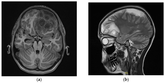 At the end of December 2021, due to a significant deterioration of the general condition (i.e., the patient was conscious, but lethargic, with headaches, vomiting, and slight weakness in the right limbs 4+/5 on the Lovett’s scale of muscle strength), an urgent MRI examination of the head was performed. The MRI demonstrated significant progression of brain abscesses with edema and mass effect, leading to displacement of midline structures at the right side (Figure 2a,b). Partial recanalization of the superior sagittal sinus was described. Due to subdural empyema, mainly in the left frontoparietal area, neurosurgical treatment with left parietal craniotomy was applied. The operation was uneventful. Collected during the procedure purulent content was gathered for examination—a negative microbiology culture results were obtained. After the procedure, the boy’s condition remarkably improved, and limb paresis was no longer observed.