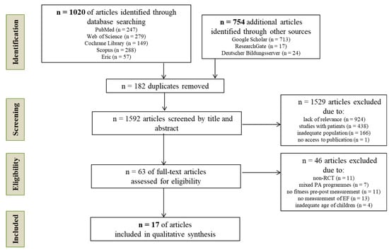 The electronic data search yielded 1774 articles, of which 17 RCTs met all inclusion criteria (Figure 1). The full text of one article could not be accessed. The characteristics of included studies in terms of short- and long-term interventions are shown in Table 3, Table 4 and Table 5. Nine studies used a single bout of PA as part of the intervention, and eight used repeated bouts of PA over weeks or months. The studies were conducted in nine countries: one in Canada [28], one in the United Kingdom [29], three in Switzerland [30,31,32], five in the United States [33,34,35,36,37], one in China [38], one in Spain [39], two in the Netherlands [40,41], two in Germany [42,43], and one in Italy [44]. The randomly allocated interventions were carried out in school settings and outside of school (laboratories and sports area). Endurance training was mainly used in short-term interventions, while long-term interventions focused on coordination. No short- and long-term strength training interventions were found, so the strength was not addressed further.