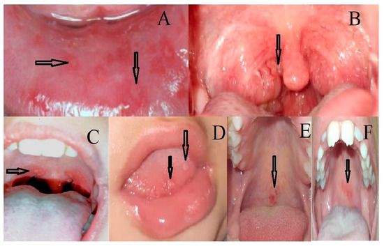 Patients were subjected to detailed history taking, including age at onset of symptoms, age of diagnosis, gender, other affected siblings, affected parents, and features of attacks (frequency, duration, and clinical manifestations). We observed that a percentage of the children presented with recurrent fever and oral lesions, which are not the classical aphthous stomatitis that is presented in PFAPA (Figure 1A,B). The range of the oral lesions observed in our study is illustrated in (Figure 1C–F).