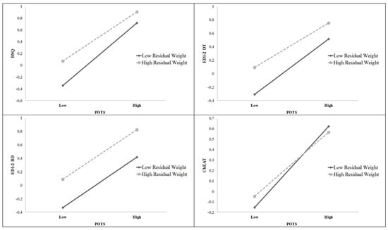 Interaction between residual weight and POTS-WT in predicting BSQ, EDI-2 DT, EDI-2 BD and ChEAT in adolescents.