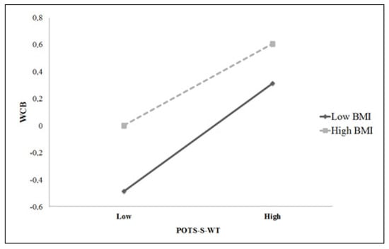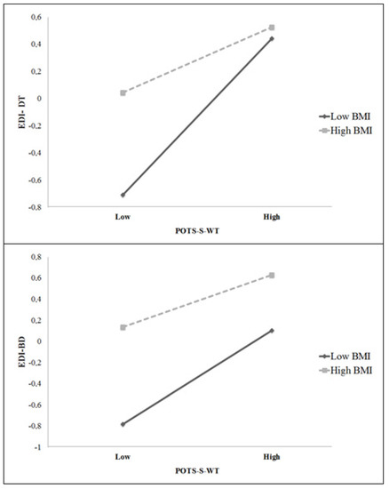 Interaction between BMI and POTS-S-WT in predicting WCB, EDI-DT, and EDI-BD in adults.