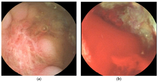 On the third day in the ICU, the patient had massive hematochezia (900 cc), which was the first episode of bloody stools. Vital signs were stable, and no sources of acute bleeding, such as extravasation or pseudoaneurysms, were observed on CT. On colonoscopy, ulcerations were observed in the distal terminal ileum and ileocecal valve. Although observation of the colonic mucosa was limited to blood, there was no focus of active bleeding (Figure 3).