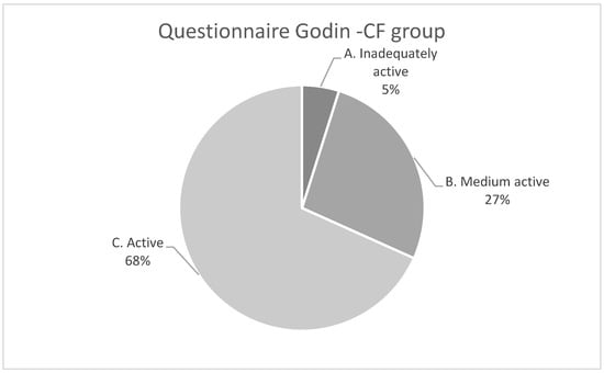On the other hand, the healthy subjects who participated in the study were more active, with 83% showing strenuous physical activity and 17% presenting medium-intensity activity. Supervised training is more efficient in long-term adherence to the exercise program than an unsupervised or partially supervised exercise program [31,32]. Furthermore, advances in technology have contributed to the engagement of patients with CF in exercise training, as López-Liria et al. demonstrated that video games can be an excellent alternative to conventional treatment and recorded high levels of adherence to active components, making the treatment more entertaining [33].