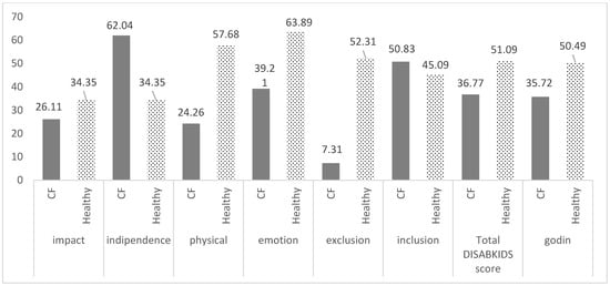 PwCF were more independent compared to their healthy peers; while they presented a more affected QoL in total and experienced more physical restriction due to the disease, they also experienced a negative impact on their emotional health and social exclusion (stigma, feeling left out) (p < 0.05, Figure 2).