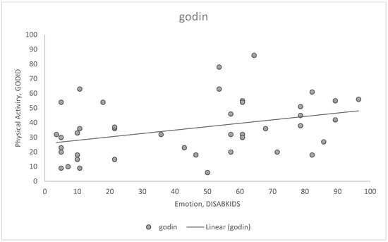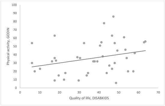 Moreover, a positive correlation between physical activity level and emotional health was observed (r2: 0.414, p < 0.05, Figure 3). Moreover, patients with more significant physical activity levels showed a better overall QoL (r2: 0.372, p < 0.05, Figure 4).