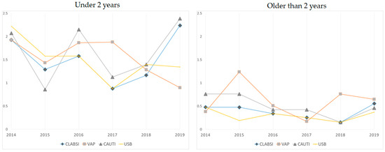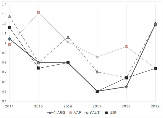 In comparing the two periods (2014–2016 vs. 2017–2019), a decrease in all the cumulative incidences was observed, this being especially evident for USB: CLABSIs, 0.879 vs. 0.727, VAP 1.103 vs. 0.863, CAUTIs 1.047 vs. 0.829 and USBs 2.206 vs. 0.659.