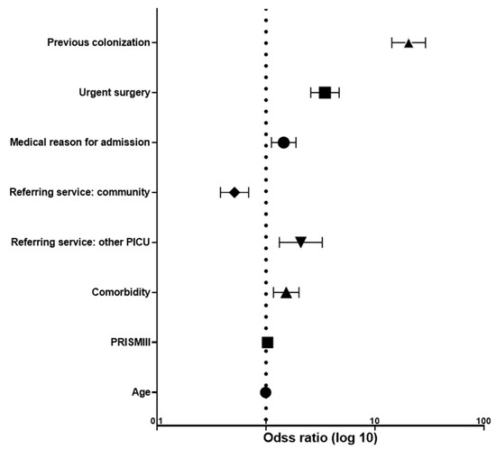 In the multivariate analysis (Figure 4), the detected intrinsic risk factors for HAIs were: previous bacterial colonization (OR 20.4; 95%CI 14.3–29.1), need for urgent surgery (OR 3.5; 95% CI 2.6–4.7), medical reason for admission (OR 1.5; 95% CI 1.1–1.9), other PICUs as a referring service (OR 2.1; 95% CI 1.3–3.3), presence of a comorbidity (OR 1.5, 95%CI 1.2–2.0) and higher PRISM III score (OR 1.03, 95% CI 1.02–1.04).