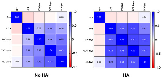 The correlation coefficient was calculated using Spearman’s rank correlation coefficient. A color scale has been used to represent the correlations: blue for positive correlations and red for negative correlations. CVC: central venous catheter; HAI: healthcare-associated infections; LOS: length of stay; MV: mechanical ventilation; UC: urinary catheter.