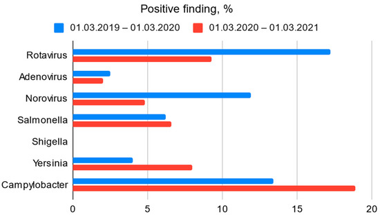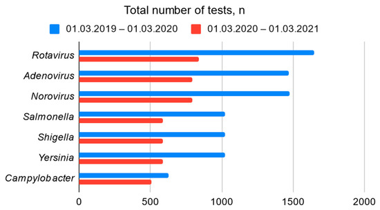 All retrospective data presented in the study (number of hospitalized patients, performed laboratory tests, etc.) were obtained from Children’s Clinical University Hospital and Laboratory information systems. To estimate a possible impact of COVID-19 pandemic associated restrictions on the size of the study population, the total number of stool tests performed for EAOD and Infectious Diseases department’s patients, and positive bacterial and viral findings in comparable time periods before and during COVID-19 pandemic 1.03.2019–1.03.2020 and 1.03.2020–1.03.2021 were compared.