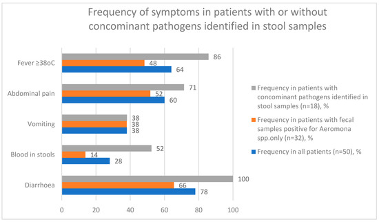 Frequency of symptoms in patients with or without concomitant pathogens identified in stool samples.