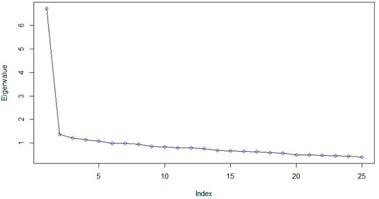 Exploratory factor analyses were performed with the total sample. First, we analyzed the adequacy of the procedure using sphericity tests, obtaining a value of 0.88 for the Kaiser-Meyer-Olkin test and p < 0.001 for Bartlett’s test. For the original CD-RISC-25SA, the overall Cronbach alpha was very good at 0.90. We kept all the factors to analyze the original five-dimensional structure of the instrument. The scree plot provided in Figure 1 indicates the unidimensional nature of the CD-RISC-25SA.