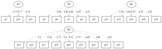 Confirmatory Analysis Path Diagram for the Four-Factor Model*. *D1 self-confidence and self-trust from previous experiences, D2 internal resources to cope with difficulties, D3 personal competence and tenacity, and D4 self-regulation and external resources.