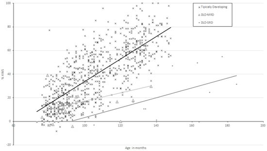 Scores for performance on the KWS test (in %) according to age in months by group (typically developing, DLD-MRD, and DLD-SRD).