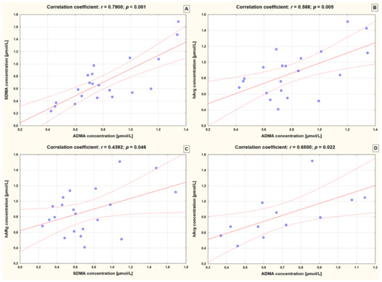 Significant correlations between arginine derivatives in controls (A–C) and epileptic children receiving 2 AEDs (D). ADMA—asymmetric dimethylarginine; SDMA—symmetric dimethylarginine; hArg—homoarginine; r—Pearson’s correlation coefficient.