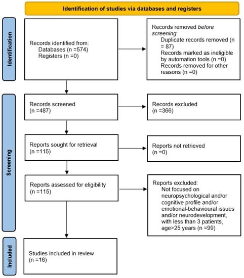 These searches returned 574 articles. We then eliminated duplicates and were left with 487 studies. We then reviewed titles and abstracts and eliminated all articles that did not focus on pentasomy and tetrasomy. This left us with 121 studies. We then excluded articles that were not in English or Italian, which left 115 studies. At this point, two independent authors selected those articles that focused on neuropsychological and/or cognitive profile, emotional-behavioural issues, neurodevelopment, pentasomy, and tetrasomy, and included three or more patients in the study who were aged between 0–25. After our selection, 16 articles fulfilled the inclusion criteria.