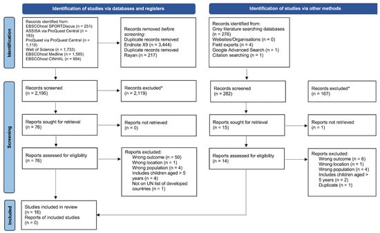 PRISMA 2020 flow diagram for new systematic reviews which included searches of databases, registers, and other sources. Note: * Automation tools were not used; n = number; UN = United Nation.