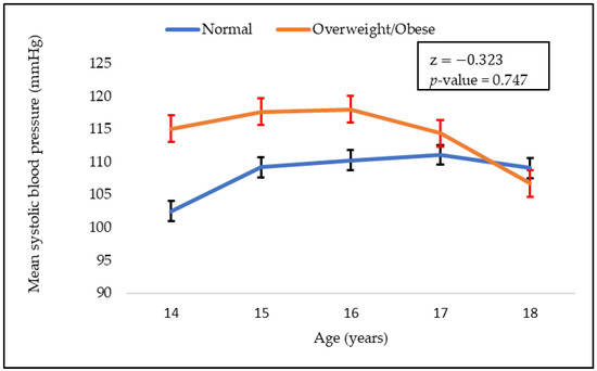 Adolescent’s mean systolic blood pressure values according to their BMI group (normal and overweight).
