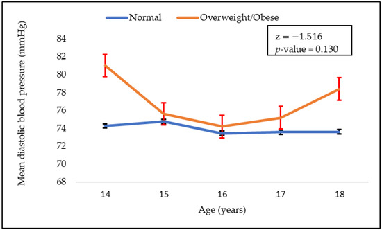 Adolescent’s mean diastolic blood pressure values according to their BMI group (normal and overweight).