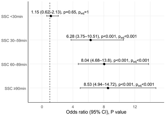 Longer SSC duration after CSs led to an increased rate of EIBF. After adjustment for potential confounding factors, SSC durations of at least 90 min, 60–89 min and 30–59 min were significantly associated with 8.53 times (95%CI: 4.94–14.72, Padj < 0.001), 8.04 times (95%CI: 4.68–13.80, Padj < 0.001) and 6.28 times (95%CI: 3.75–10.51, Padj < 0.001), respectively, higher EIBF rates compared to those without immediate SSC (Figure 1).