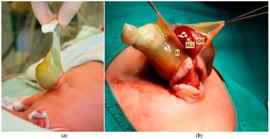 (a) A small abdominal wall defect of three centimeters in diameter and an intact hernia sac (H) were identified after birth. (b) Exposure of the accessory liver lobe (ALL) with embedded gallbladder (GB) after the opening of the membrane of the hernia sac (H).