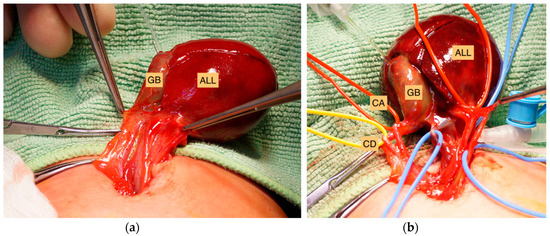 (a) Identification of the pediculated accessory liver lobe (ALL) with embedded gallbladder (GB). The ALL, cleaved into two liver segments, was completely separated from the abdominal liver and connected via a six-centimeter pedicle. (b) After the dissection of the pedicle of the ALL, eight structures containing blood vessels, a cystic duct (CD) and cystic artery (CA) were identified within the pedicle.