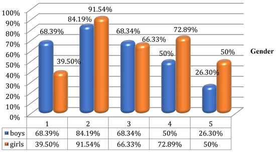 Percentage interpretation of the results for questions 1–5, and 6–10 depending on the gender of the participants are illustrated in Figure 1 and Figure 2.