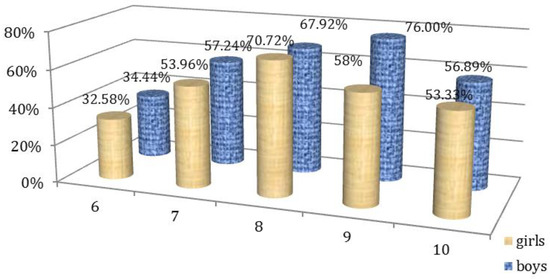 Of the subjects investigated, 192 were girls, and 152 were boys. The girls, therefore, constituted 55.81% and the boys constituted 44.19% of the group.