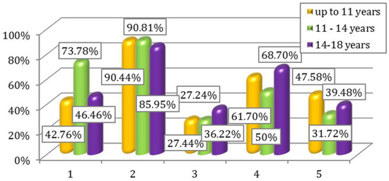 Percentage interpretation of the results for questions 1–5, respectively 6–10 depending on the age groups of the participants are illustrated in Figure 3 and Figure 4.