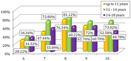 Correctly assimilated oral hygiene skills at the age of 11–14, as opposed to a younger age category and young permanent teeth not yet attacked by cariogenic agents for long periods, as in the case of the most “elderly” group, explain the better results of this age group to this question.