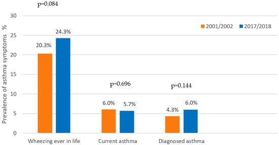 The self-reported prevalence of current asthma symptoms in 2018 was 5.7%. None of the asthma variables changed significantly in comparison with the results from 2002 (Figure 1).