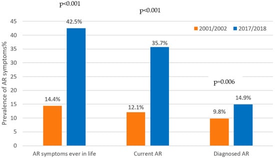 Significant rise in the self-reported prevalence of AR symptoms and diagnoses, 2002–2018.
