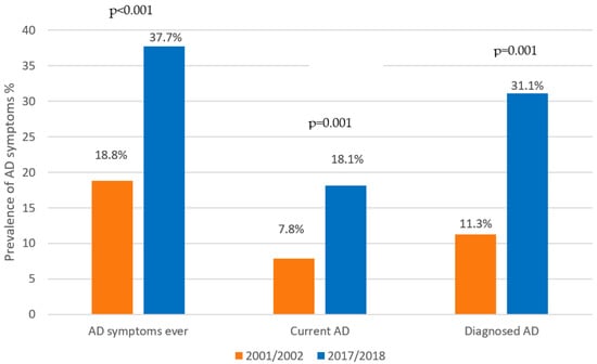 The self-reported prevalence of current AD in 2018 was 18.1%. The symptoms of AD ever-in-a-lifetime increased by 19% (p < 0.001), current AD by 10% (p < 0.001) and self-reported AD diagnoses by 20% (p = 0.001) in comparison with the previous study (Figure 3).