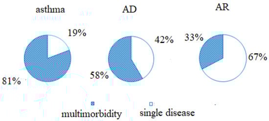 In regard to the frequency of allergic multimorbidities in 2018 (at least two allergic diseases simultaneously), it was demonstrated that current AR was dominantly a single disease (67% children). Asthma appeared to be the syndrome with the highest rate of multimorbidity (81%), while multimorbidities were also frequent in patients with current AD symptoms (58%) (Figure 4).
