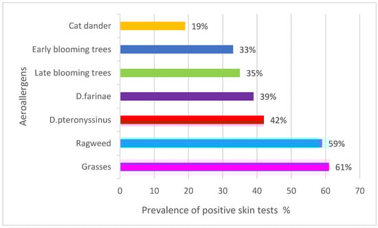 Among the tested children, 47% of them had at least one positive skin test. The most common allergens were grasses followed by ragweed, Dermatophagoides pteronyssinus, Dermatophagoides farinae, late blooming trees, early blooming trees and cat dander (Figure 5).