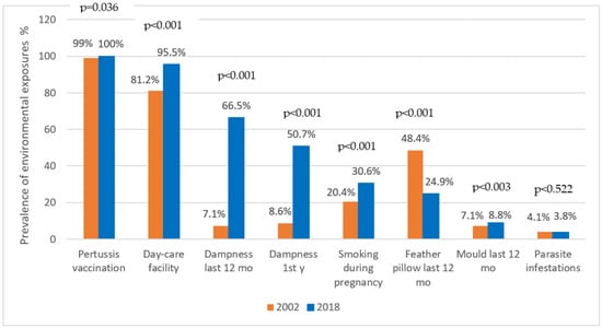Among the environmental exposures assessed by the questionnaire, we compared the prevalence of those that were indicated as risks or as protective in the previous investigation in the city of Zagreb [15], and the association of those factors with allergic symptoms was studied in the logistic regression. All the questionnaires were checked, and inconsistent answers were discussed with parents. Skin prick tests (SPT) to common whole aeroallergen extracts (Allergopharma® GmbH & Co. KG, Reinbek, Germany) were conducted on 354 children aged 10 in 2002 and 208 children aged 7–14 in 2018 according to the standardised methodology [18]. The set of the tested allergens included grasses, ragweed, Dermatophagoides pteronyssinus, Dermatophagoides farinae, late blooming trees, early blooming trees and cat dander.