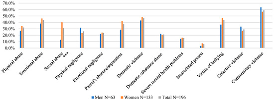 A comparison between the types of ACEs affecting men and women reveals some differences in the sample (Figure 1). Men (31.7%) report more experiences of physical neglect, community violence (63.5%), having a family member with alcohol and substance use problems (22.2%), and collective violence (33.3%), than women. For their part, women report more experiences of sexual abuse (40.1%), physical abuse (34.3%), emotional abuse (46%), emotional neglect (24.1%), bullying (47.1%), parental absence or separation/divorce (41.9%), witnessing violence in the household (48.2%), having incarcerated family members (7.3%), and having family members with mental disease (16.1%). Even though these results indicate that early adverse experiences differ by sex, the differences are only significant for sexual abuse.