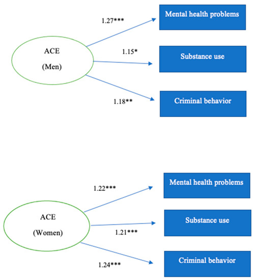 Figure 2 shows the Poisson regression models for men and women, revealing that consequences in terms of mental health, substance use, and criminal behaviors, depend on ACEs.