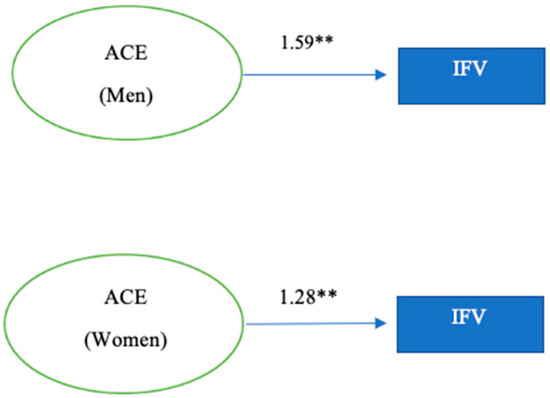 Lastly, the intrafamily violence model indicates that, as ACEs increase, the likelihood of having lodged an IFV report or having been reported for IFV, increases by 59% in men. In contrast, an increase in ACEs for women only increases by 28% the lifetime probability of having lodged an IFV report or having been reported for IFV (Table 14).