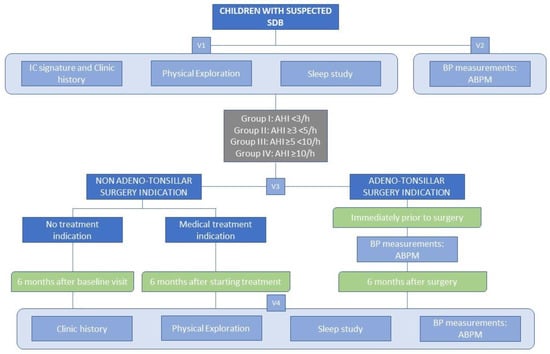 In order to assess the impact of SDB treatment on BP, measurements were repeated after therapeutic application (V4). In patients who do not require treatment or are referred for medical or orthodontic treatment, the tests were repeated 6 months after the therapeutic decision was made (ABPM, PSG, and organ damage studies, if applicable). In patients referred for adeno-tonsillar surgery, the procedures were repeated just before the intervention (ABPM) and six months after it (ABPM, PSG, and organ damage studies if applicable). Thus, a control group was available without impeding the treatment of any patient and without allowing delays in its application linked to the study (Figure 3).