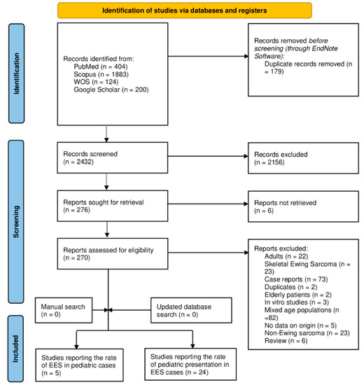 A summary of the results of the electronic database search, as well as the screening stage, is provided in Figure 1. The initial database search resulted in 2611 references, out of which 179 duplicated records were found and removed using the EndNote software (version 8). The titles and abstracts of 2432 articles were screened, resulting in 276 articles eligible for full-text screening. The full texts of six studies were not found and, therefore, these were excluded. A total of 241 studies were excluded as follows: adult cases (n = 22), skeletal involvement (n = 23), case reports (n = 73), duplicated records (n = 2), elderly cases (n = 2), in vitro studies (n = 3), mixed-age populations (n = 82), no data on sarcoma origin (n = 5), non-Ewing sarcoma (n = 23), and reviews (n = 6). The updated and manual search yielded no more studies, so that the final number of included studies was equal to 29 reports. Twenty-four articles reported the rate of childhood cases among those with EES (of all ages), while five studies reported the rate of extraosseous involvement in pediatric Ewing sarcoma (of mixed origin—skeletal and extraosseous) cases.