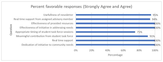 All of the schools who were invited to participate in the program accepted. There was an 83% response rate to the survey sent to the participating school districts to evaluate our COVID SOS initiative. The survey questions explored the impact, effectiveness, and timely support of the COVID SOS initiative as well as addressing community needs and providing resources. The responses were scored on a 5-point Likert scale from ‘strongly agree’ to ‘strongly disagree’ as well as open-ended questions for comments regarding the initiative. ‘Strongly agree’ and ‘agree’ responses were grouped as favorable as shown in Figure 2. Qualitative responses from open-ended feedback are shown in Table 1.