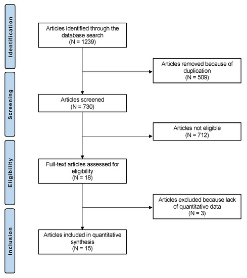 The literature search resulted in 1239 articles. Of them, 509 were duplicates. A further 712 studies were excluded as they did not match the eligibility criteria: not matching the topic (n = 394), study type and design (n = 238), congenital or acute patellofemoral instability (n = 42), not using autografts (n = 31), language limitation (n = 4), and exclusive focus on hyperlaxity (n = 3). A further three studies were excluded as they did not report quantitative data on the outcomes of interest. The flowchart of this literature search is shown in Figure 1.