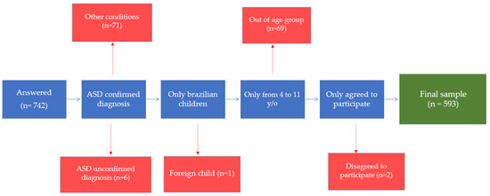 Of 742 participants who accessed the questionnaire, 593 constituted the final sample (Figure 1). Seventy-one children excluded from the sample were without ASD but had other conditions, such as Down syndrome, food intolerance, and allergies or had no diagnosed condition. Children with a confirmed diagnosis of ASD could have, in this study, other coexisting conditions beyond ASD.