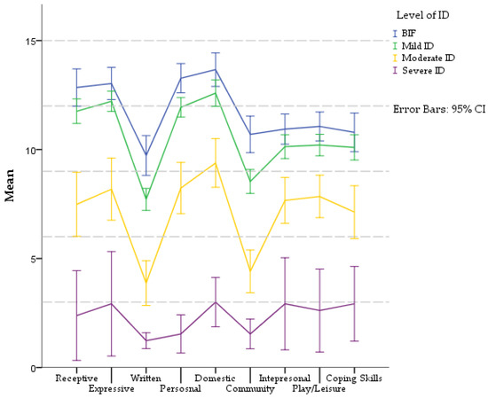 We found very similar results when evaluating the subdomains (Table 3). Based on the results of the post hoc analysis (Games–Howell post hoc test), the groups differed significantly in all subdomains except for children with BIF and Mild ID. They differed significantly only in the subdomains Daily Living Skills—Personal (p = 0.007), Daily Living Skills—Community (p < 0.001), and Communication—Written (p < 0.001). In the other subdomains, children from these two groups achieved very similar results: Socialization—Interpersonal (p = 0.558), Socialization—Play/Leisure (p = 0.292), Socialization—Coping Skills (p = 0.760), Daily Living Skills—Domestic (p = 0.319), Communication—Receptive (p = 0.162), and Communication—Expressive (p = 0.200). Descriptive statistics of each subdomain, mean differences, and post hoc analysis are reported in Appendix A Table A2 and Table A3.