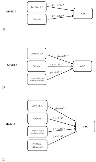 Hierarchical regression models for predicting ABC scores. Significant predictors were in four steps of regression: (a) Level of ID, (b) Level of ID and Gender of children, (c) Level of ID, Gender, and factors related to institutional care—Length of stay and Type of institutional care, (d) Level of ID, Gender, factors related to institutional care—Length of stay, Type of institutional care, and risk factors in development—Neonatal difficulties. * p < 0.05, ** p < 0.01.