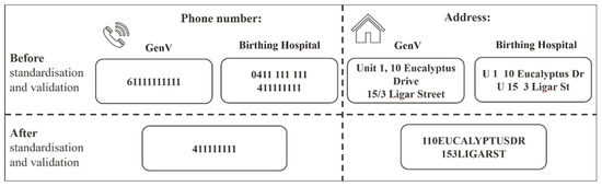 TN: We standardized telephone numbers in adherence to Australian Telecommunications standards (Figure 1) [26]. The hospital’s dataset has two TN variables (‘mobile number’ and ‘other phone’) while the GenV cohort has one TN variable (with 1.1% of values missing). We combined the two hospital TN variables into one TN variable and reduced the missing values to 3.5%. This required converting raw telephone numbers into the standard format and the removal of special characters such as apostrophes or hyphens. In addition, country code was removed and the leading ‘0’ was removed.