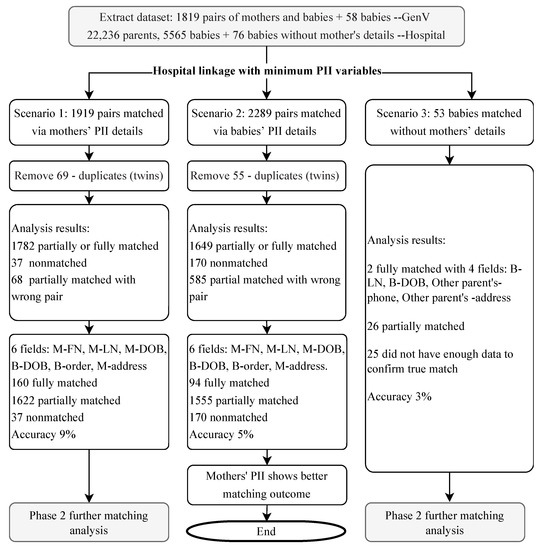 In Scenario 3, for the 58 babies without mothers’ details, 53 babies from the hospital dataset were initially identified, with 28 babies partially or fully matched. A combination of other parents’ and babies’ PII details was used for further matching process.
